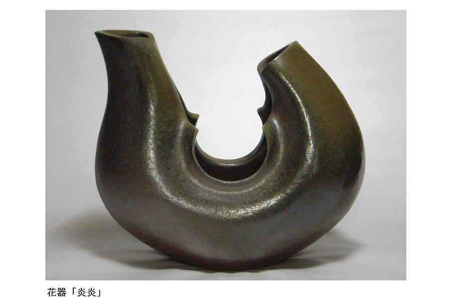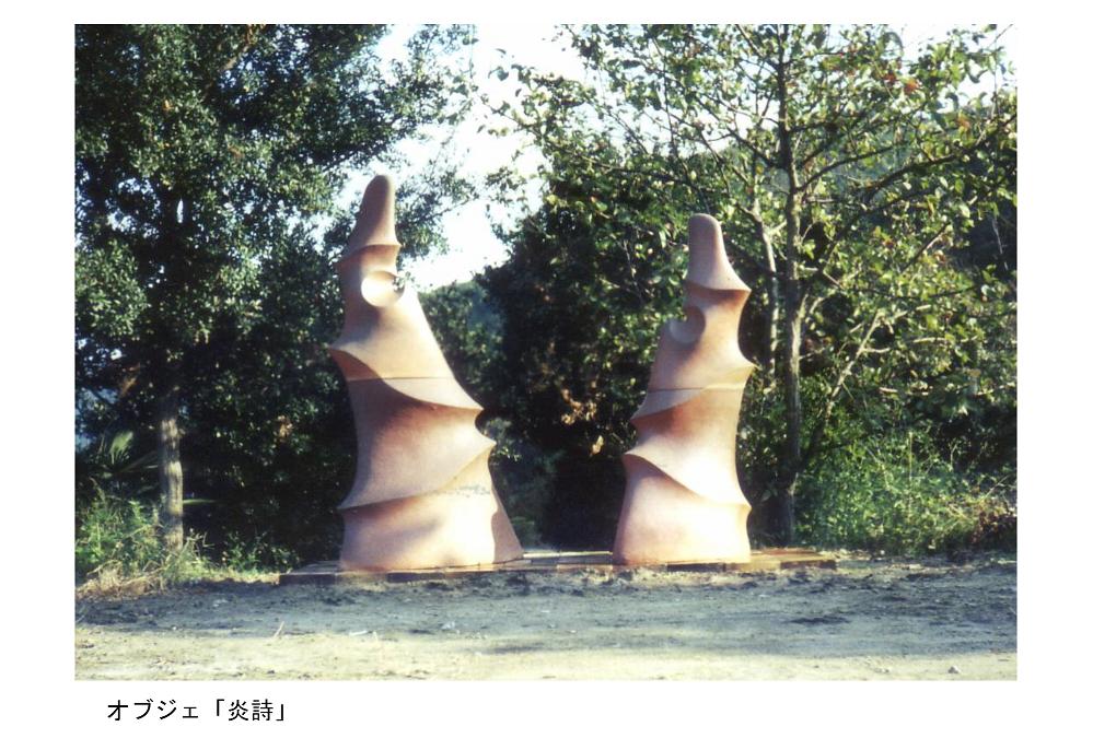 きめの細かさ、土味は優れていても耐火度が弱いため大きな構造物には向かない。この素材ではタイルにして組み立てる表現に限られてしまう。こうしてだんだん信楽土をベースに陶彫やオブジェを作るようになった。「炎詩」高さ約180センチ